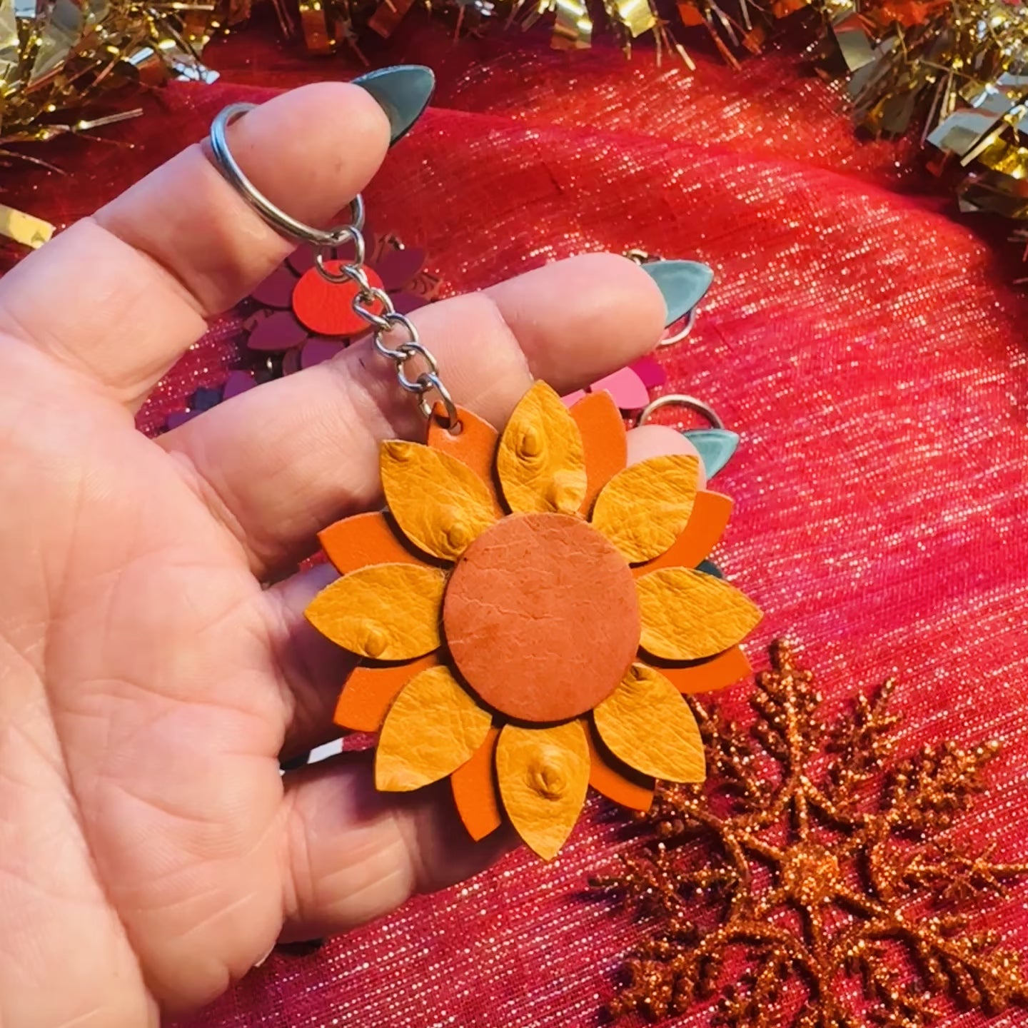 Brighten up your everyday with this beautiful handcrafted leather sunflower keyring. Dangling elegantly from a split ring, this charming accessory adds a touch of sunshine to your keys, bags, rucksacks, or anywhere you need a little joy.